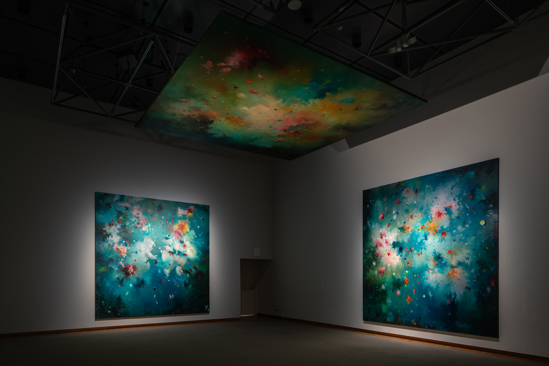 天井から吊り下げられたバーシム・アル・シャーケルの《スカイ・レボリューション》は、2003年のイラク戦争での爆撃直後に目撃した光景を描いた〈4分間〉シリーズの一作品です。大聖堂などの巨大な天井画を彷彿とさせ、下から絵を見上げると空爆の際の空が迫ってくるようです。空、大気、頭上に飛び散る瓦礫、そして耳をつんざくような爆音とともに、一瞬凍りついたような奇妙な静けさが彼の記憶に刻み込まれました。