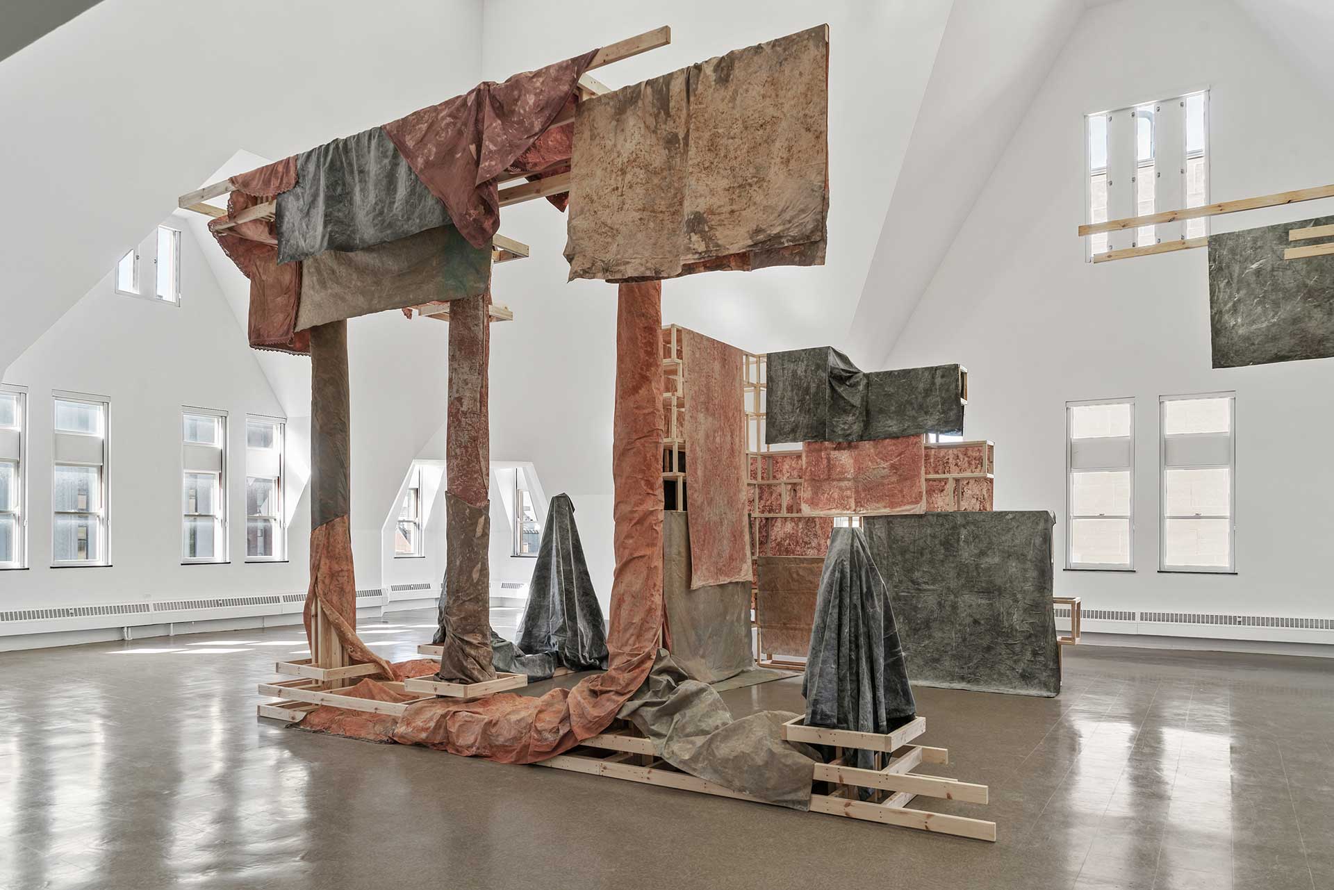 ダラ・ナセルは、絵画やインスタレーション、染織などの作品を通じて、戦争と記憶、地政学的な不安定さといったテーマを探求しています。染色した布を使ったナセルの大規模なインスタレーションは、土地や身体の痕跡を記録しています。儀式のようなプロセスと労働が布や顔料の中に層として残され、時間の堆積や土地の記憶を呼び起こす装置として空間に立ち現れます。
