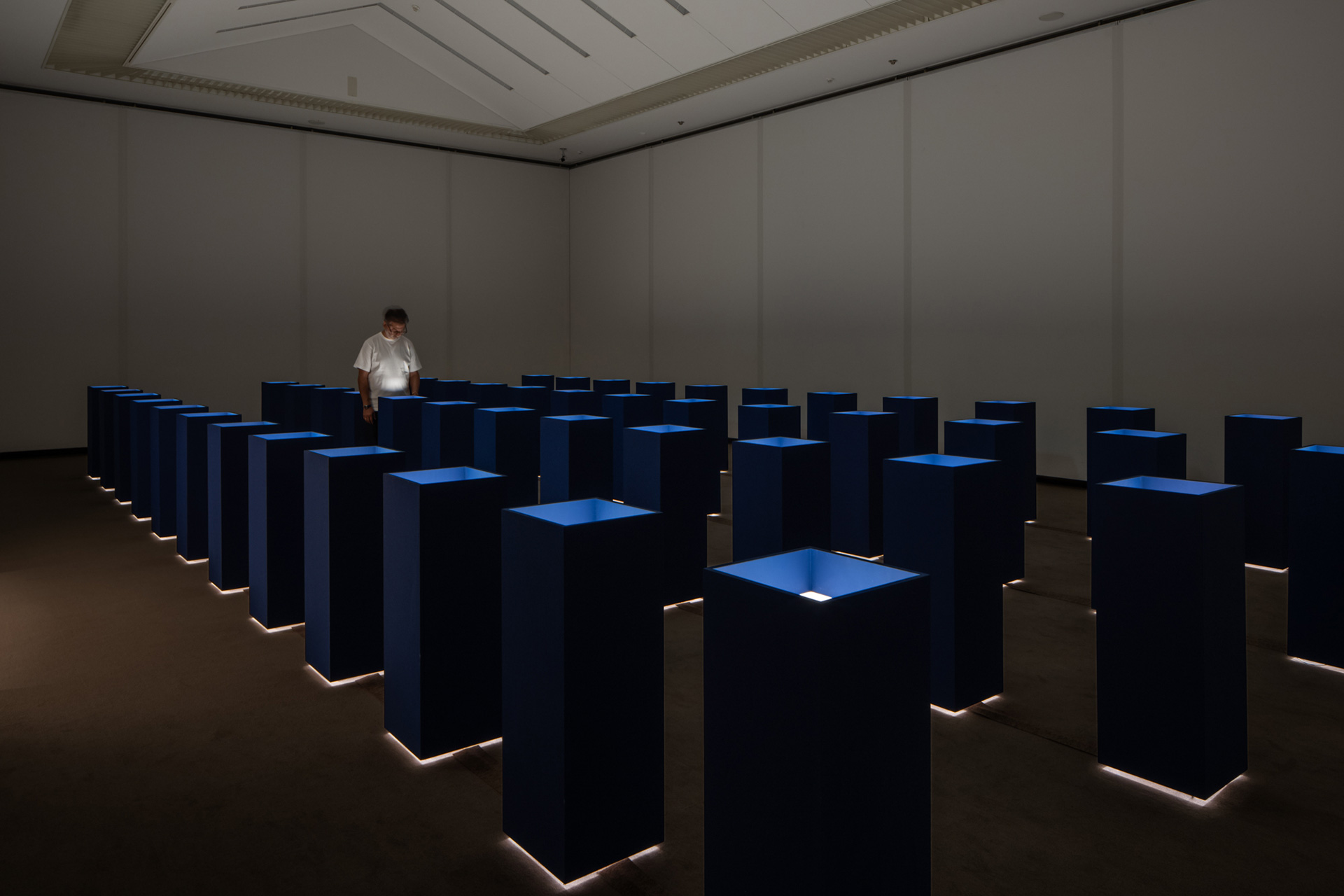 この失われた歴史を可視化するために、サルキシアンは、90点の行方不明の遺物を「リトファン」で再現し、そのうちの48点がここに展示されています。19世紀半ばに考案されたこの手法は、刻まれた像に背面から光を当てることで初めて像が浮かび上がる仕組みをもっています。本作ではその手法を応用し、3Dプリンターで出力された遺物が墓石のようにも見える台座の中で光を受け、幽玄な白黒写真のように姿を現します。浮かび上がる静謐な像は、破壊の爪痕と同時に、地域社会の再生への意志も映し出し、私たちに文化を守り継ぐ責任を問いかけます。