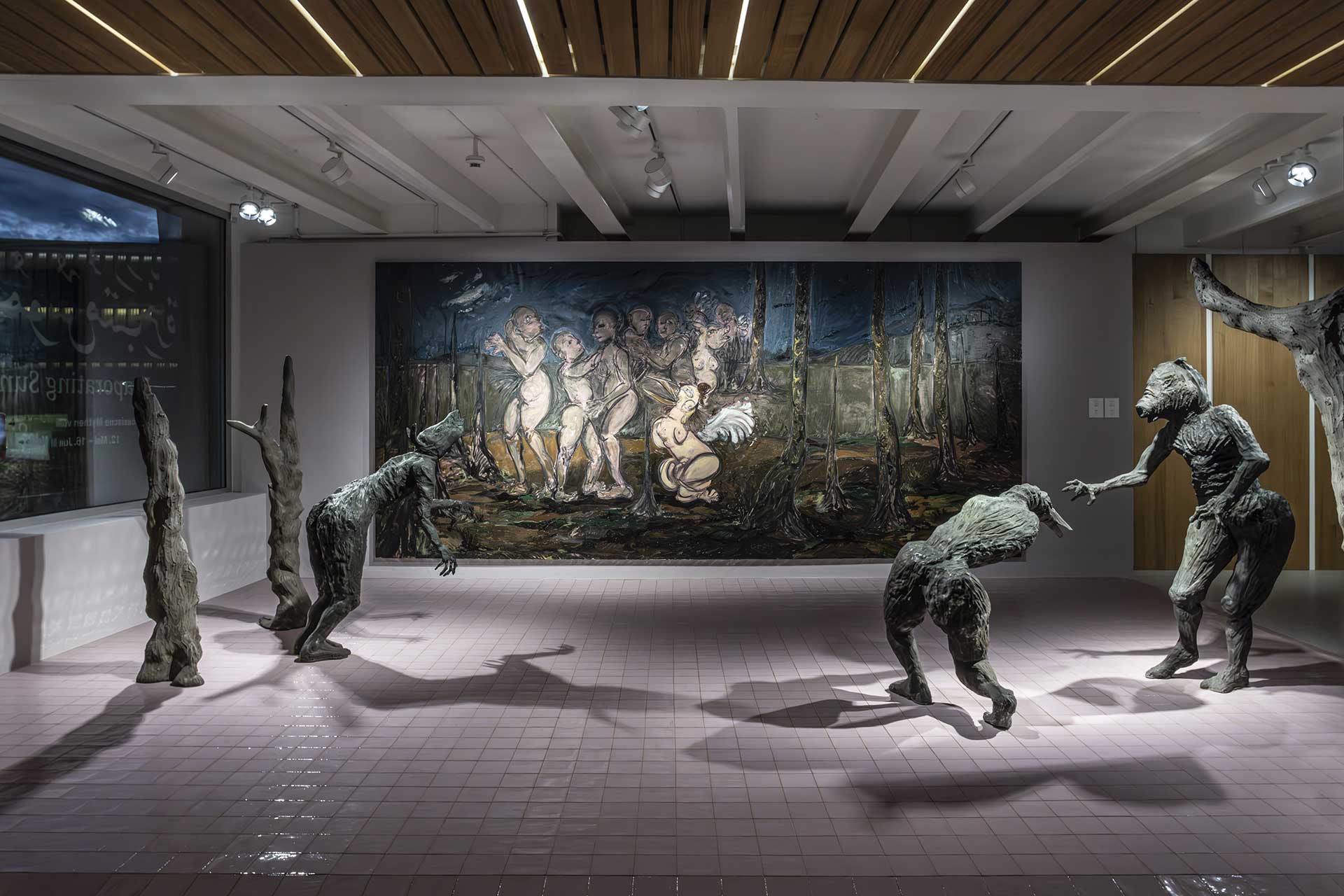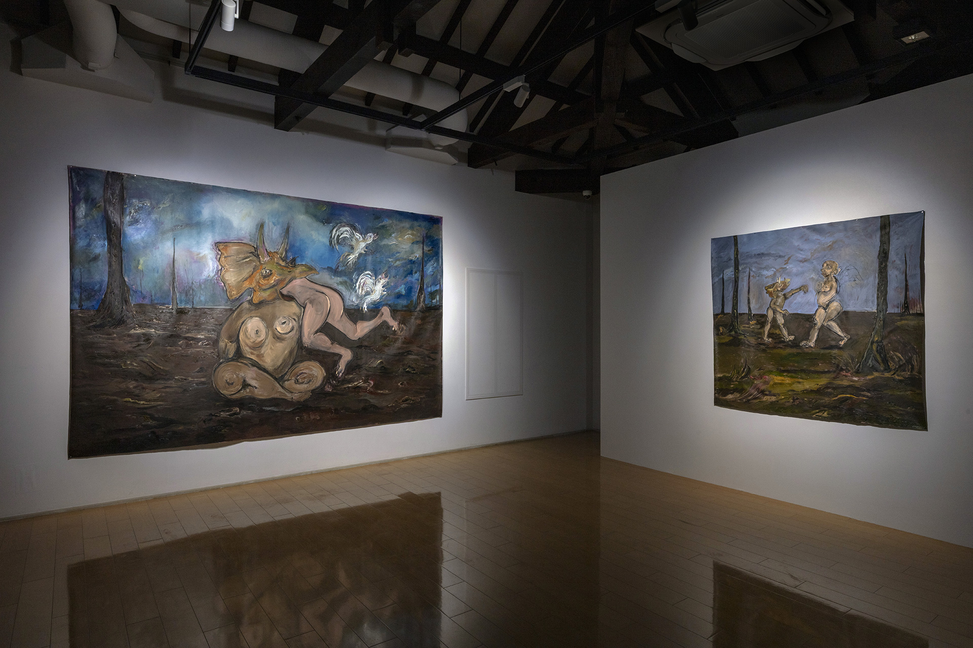 「あいち2025」では、罪悪感、生存、変容、そして希望を扱った新作を展示しています。「誕生」「ダンス」「死」という三つの章からなる絵画は、恐竜のメタファーで、母という存在の内的・外的な葛藤と、人類全体が抱えた罪悪感や人間と環境との関係を浮き彫りにします。
