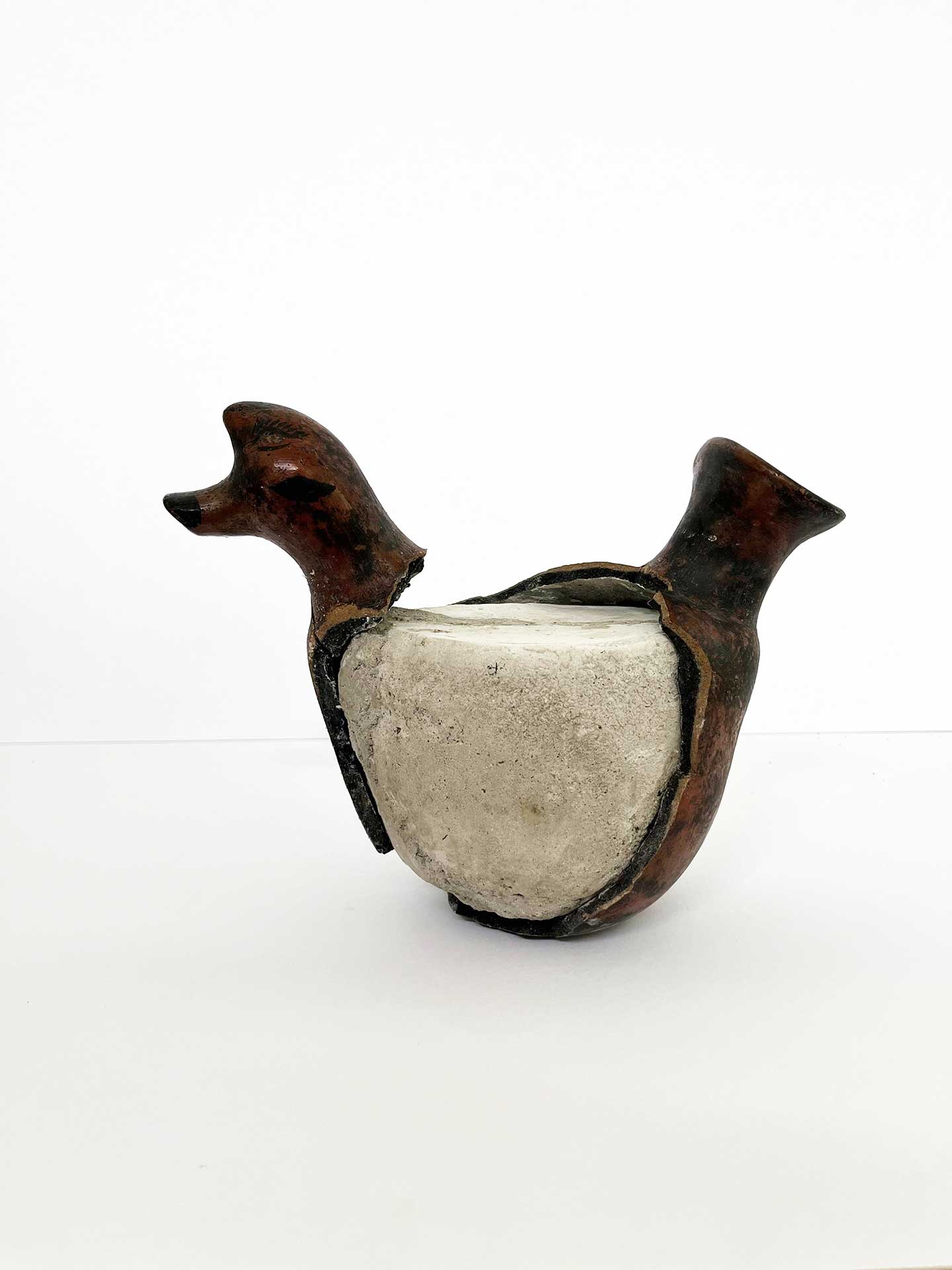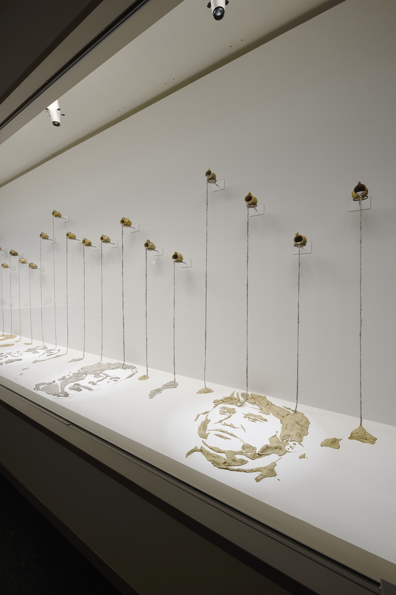 「あいち2025」で展示されている陶器は、先住民が日常生活で使用するものですが、その内側にはコンクリートが詰められています。コンクリートによって使いものにならなくなったこれらの器は、地域の支配階級が先住民のコミュニティにもたらした傷を暗に示しています。その背景には、ボロル・ボールの故郷サンフアンサカテペケスで行われたセメント工場の開発によって、地元コミュニティの水源が断たれてしまったという出来事があります。器から流れ出すコンクリートは、床に近付くにつれ土に変わり、展示ケース内の底辺に堆積して先住民の肖像画を浮かび上がらせています。メソアメリカの先住民族は、植民地化の過程において侵略や迫害を受けてきたのみならず、近現代史の大部分において、その存在を不可視のものとされてきました。これらの肖像画は、そのような状況にもかかわらず大地を守り、自然や生命の叡智を祖先から代々受け継いできた女性たちに捧げられています。