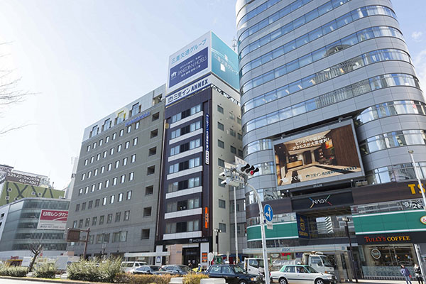 名古屋駅桜通口から徒歩5分、ビルの屋上の縦長看板「東横イン」が目印です。各会場への交通のアクセスも便利。一番近い会場「愛知芸術文化センター」へは地下鉄で9分。名古屋駅を拠点に各会場に足を運んでいただくのにも便利です。ぜひこの機会にお越しくださいませ。