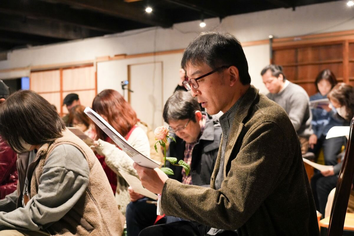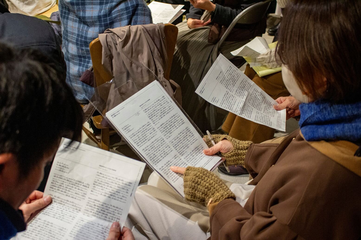 「今からこのステートメントをみんなで朗読します。」という進行役の黑田菜月さん(ラーニングチームメンバー)の呼びかけに、会場はにわかにザワつきました。長い、、、というつぶやきが聞こえてきます。確かに、A4両面に小さめの文字でびっしりと書かれているのをみると及び腰になってしまいます。「ステートメントって実はあまりちゃんと読まれないこともあると思うんですよね。」という辻琢磨さん(ラーニングチームメンバー)は、目で読むだけでなく声に出すことで、受け身ではない能動的な体験となり、より自分ごととして考えられると朗読の意図を説明します。村上慧さん(ラーニングチームメンバー)の声かけで、全員席を立って両手を伸ばして「にゃむにゃむにゃむにゃむ、、、、」という謎の呪文を唱えながら体と喉をほぐしました。ラーニングチームもゲストの石倉さんも加わり、一人一文、それぞれの読み方で30分ほどかけて、52人によって読み上げられました。朗読者の目印である薔薇を手渡しながらステートメントが読み上げられる時間と空間は、どこか静謐で儀式めいていました。