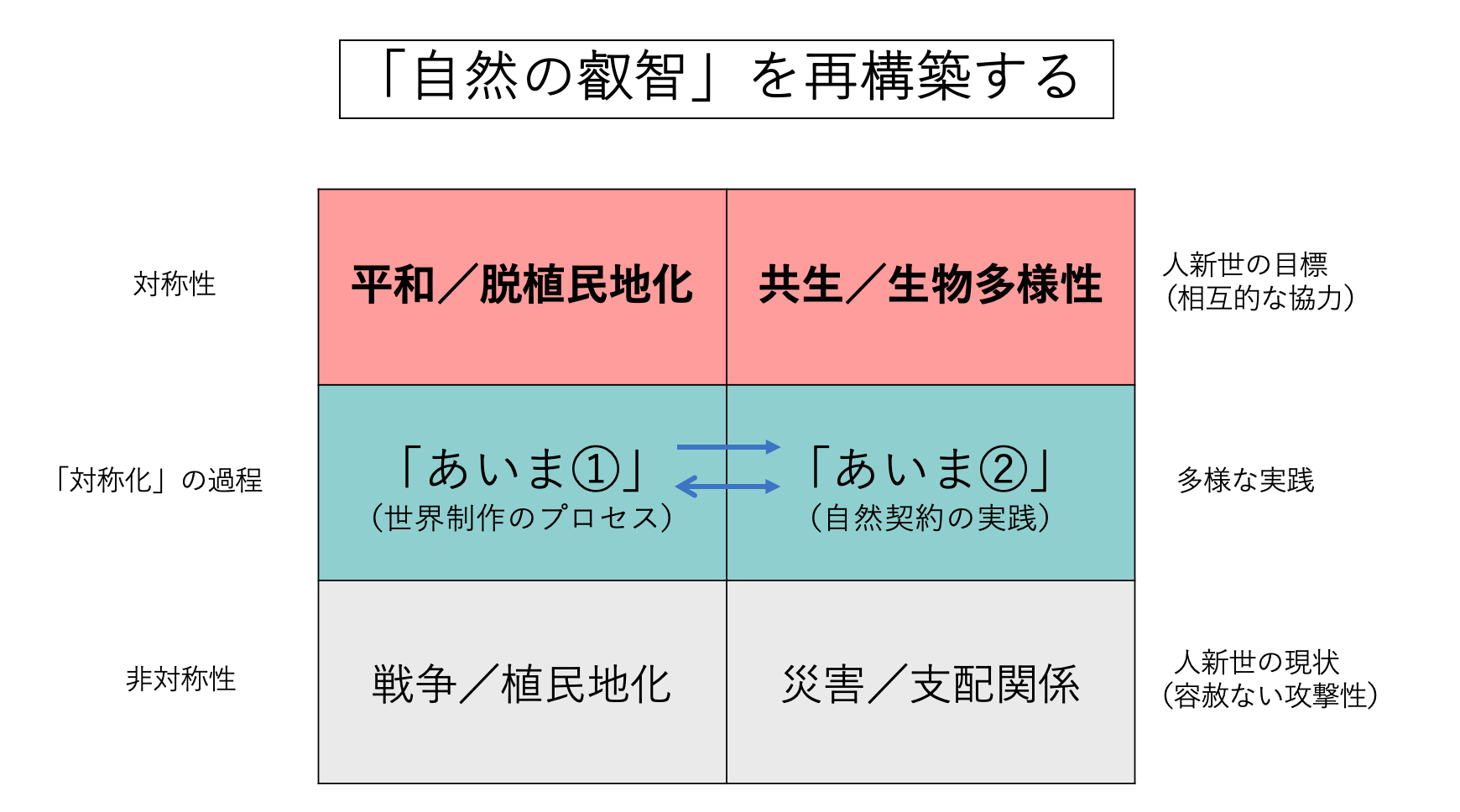 下部が「灰」の世界としての「現状」、上部が「薔薇」であり「理想」の世界像を表しています。左列は「社会関係」から見た場合、右列は「種間関係」として人とその他の生物や環境との関係性を示しています。「灰の世界」はステートメントで語られているように、人新世の現状を表し、わたしたちの「容赦ない攻撃性」が表面化しています。こうした現状から一足飛びで「薔薇の世界」に行くことはできるのでしょうか。石倉さんは、そのために「あいま」があると考えます。図5は「あいま」を取り入れた図解です。