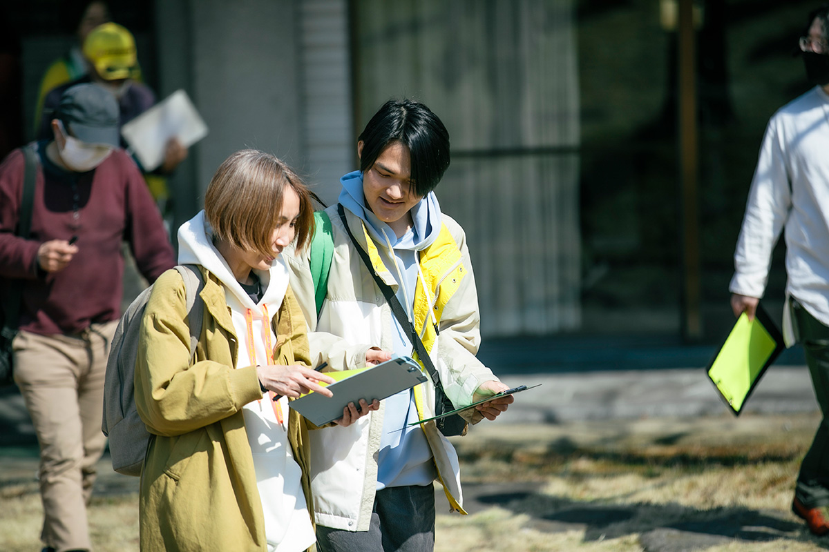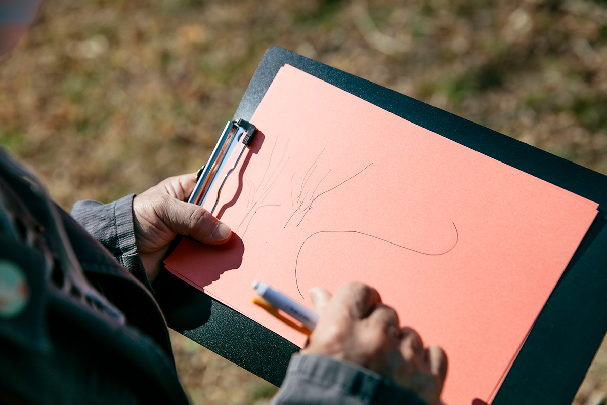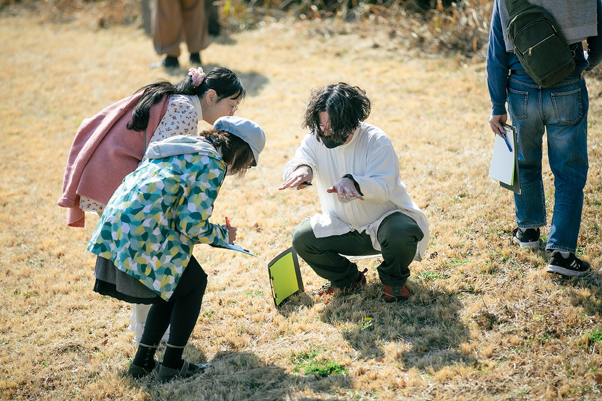 丘にあがって周囲の森林をスケッチする人もいれば、野花を丁寧に観察する人も。なかには、建物の壁面に使われているタイルに注目し、それぞれのタイルを紙にかたどり、サイズや模様を比較する人もいました。佐藤さんも散策する参加者にまじり、それぞれの観察や発見の視点を楽しみ、参加者から投げられる様々な質問の一つ一つに丁寧に向き合ってくれました。