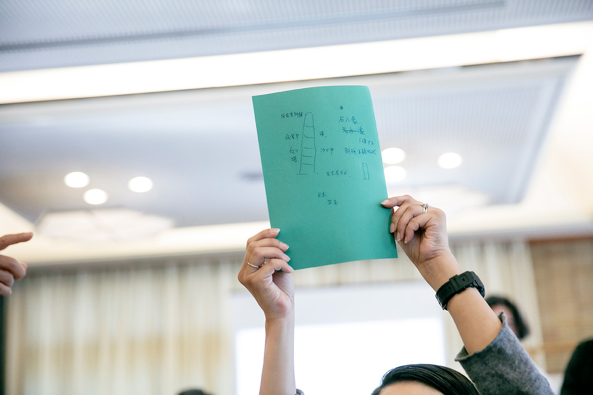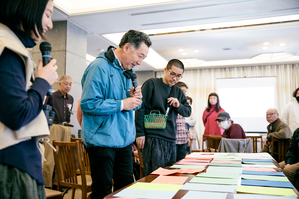 色とりどりの画用紙には、様々な発見や気づきが集まりました。屋外に設置された作品をスケッチした人もいれば、建物の構造や照明などが気になった人、木々や小花などの植物を描いた人もいました。散策中に考えたことや参加者のメモから気づいたことなどを、佐藤さんとラーニング・チームのメンバーで話し合いました。