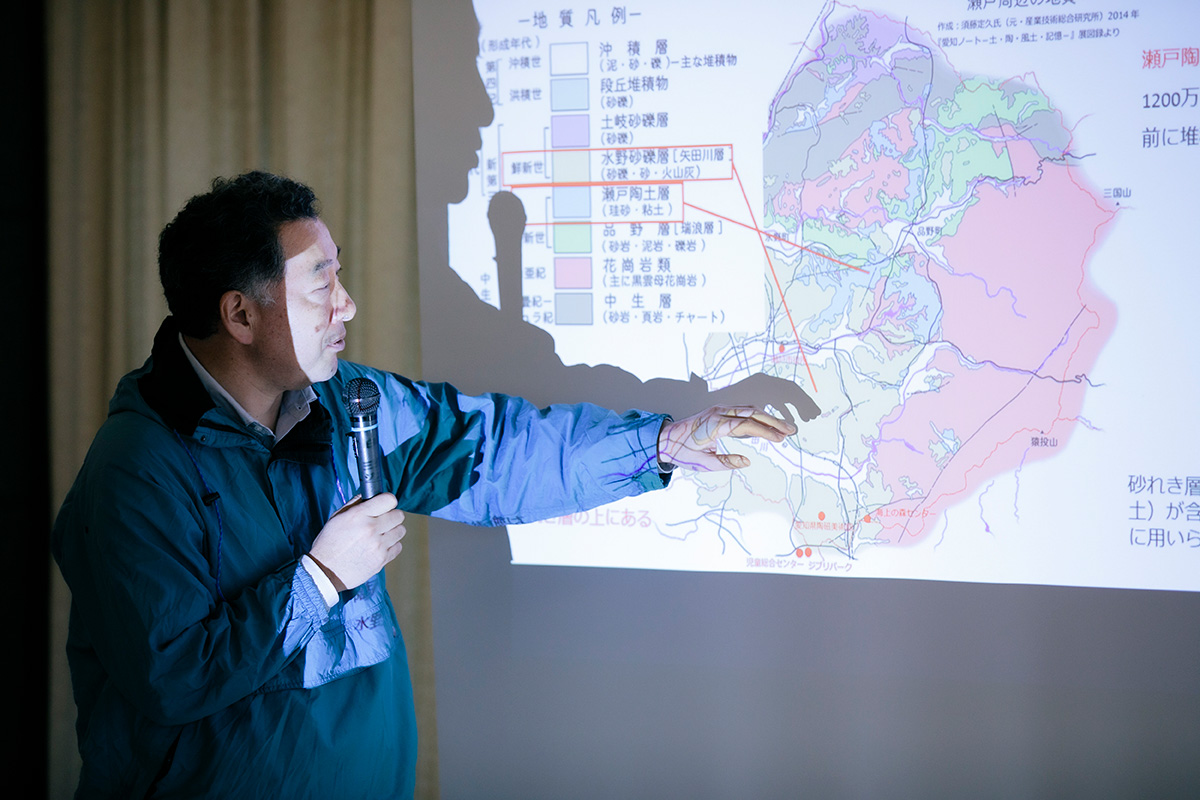 瀬戸一帯に形成された豊かな陶土層は、様々な条件が重なって奇跡的に存在していることがわかりました。もし東海湖堆積盆地の砂礫層がなかったら陶土層は剥き出しの状態で、侵食されてなくなっていたかもしれません。また火山活動がもし別の場所で起こっていれば、花崗岩は全く違うところで形成され、陶土の素がそもそもなかったかもしれません。窪地が沼になってゆっくりと時間をかけて砂や粘土が堆積したことも、良質な目の細かい粘土が形成されたことに影響しています。かつて起こった自然環境の移り変わりのどれか一つが少しでも違えば、「陶都瀬戸」は生まれなかったと言えます。瀬戸の環境の持つ特別さ、稀有さは、スライドを一つ一つ指し示しながら説明する佐藤さんの真剣な様子からも伝わってきました。