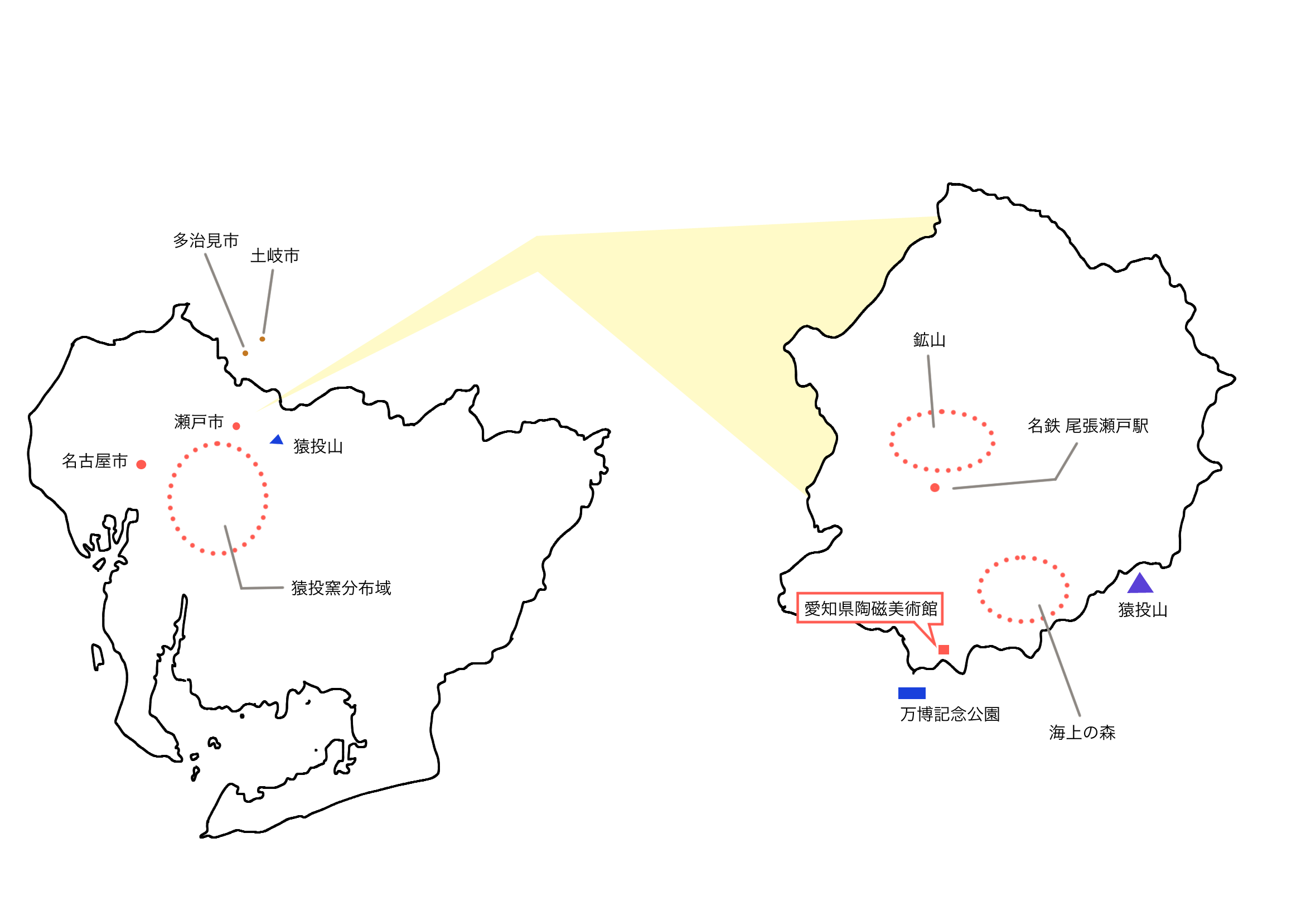 レクチャーに関連する場所を示した(筆者作成)。(左)愛知県、(右)瀬戸市