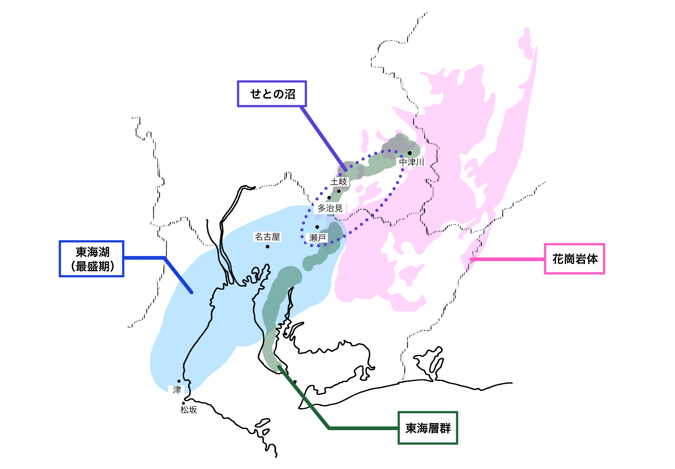 (画像2)「花崗岩体」、「せとの沼」、「東海層群」、「東海湖」の分布域を示した(筆者作成)。