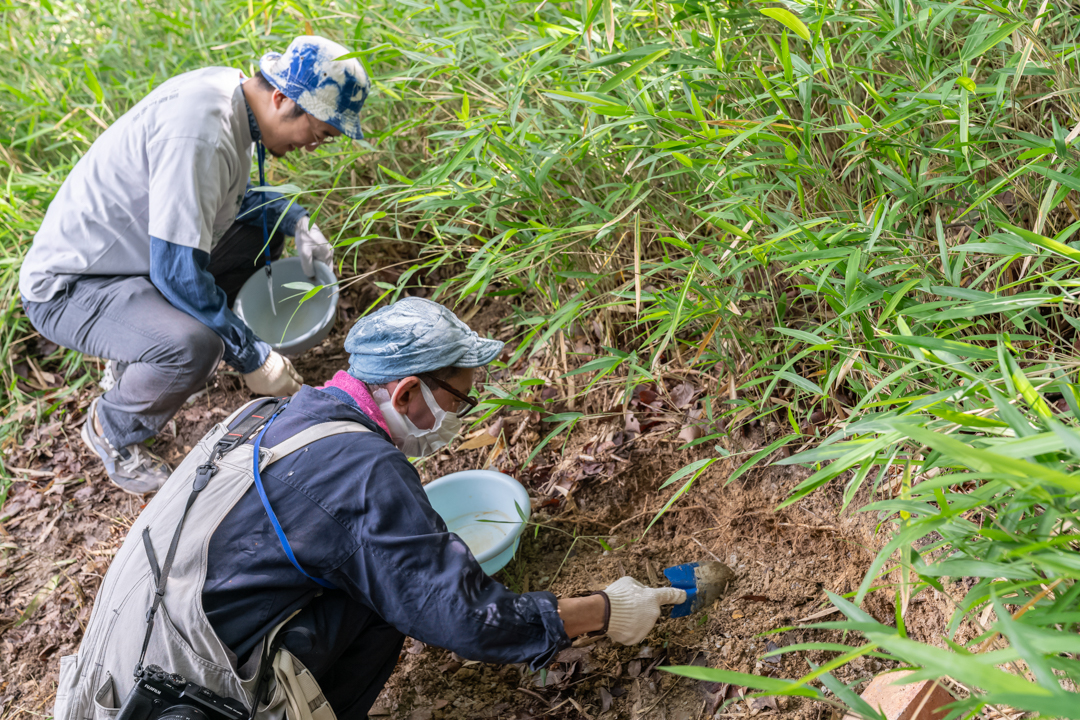 美術館には粘土層が地表に露出している箇所があります。そのうちのひとつで、陶芸館のスタッフの案内で参加者それぞれがスコップで地面を掘って粘土を集めました。採取の際には、美術館の学芸員である大西遼さんから粘土層のことや、古窯のこと、やきものの焼き方などについて参加者からの質問を受けながら説明していただきました。