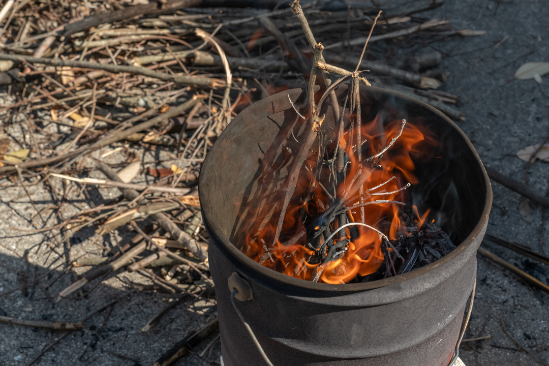 1時間程度燃やし続けると、一斗缶の中は炭化して真っ黒になった枝でいっぱいになりましたが、まだ灰にはなっていません。この炭の形が崩れて粉になるまで燃やし続ける必要があります。一般的に炭が灰になるまでには30分〜2時間程度燃やす必要がありますが、天候や炭の種類によっては2日以上かかる場合もあります。今回は、前日の雨による湿り気やさまざまな樹種が混ざっていることもあって、時間がかかりそうです。