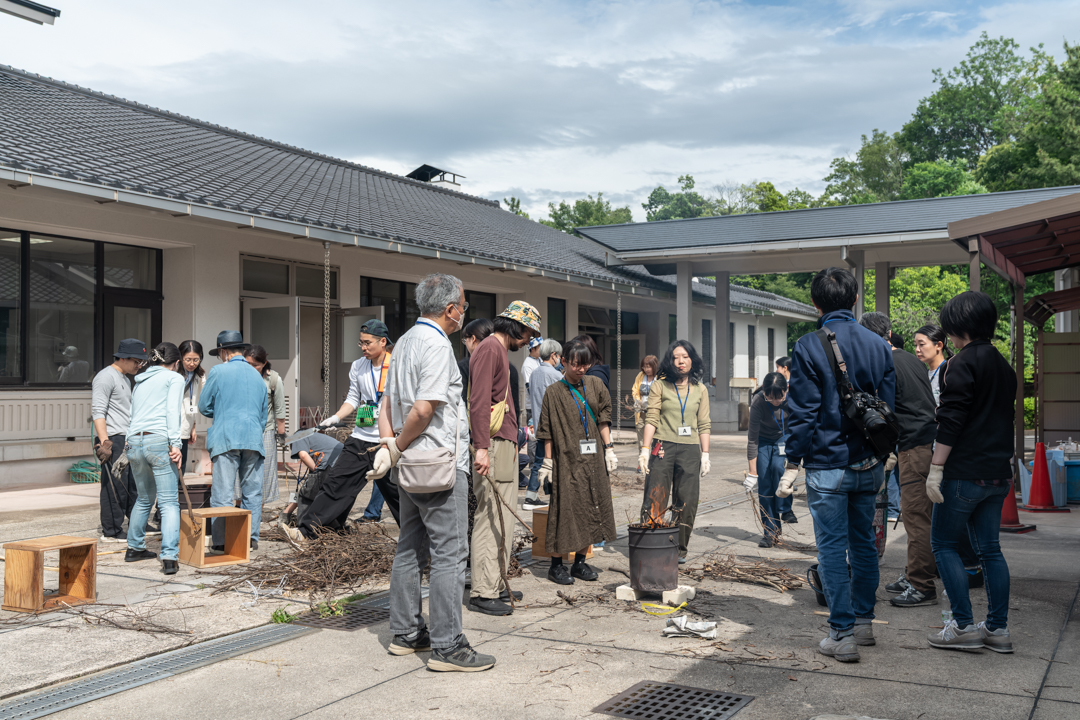 はじめに、黑田菜月さん(ラーニングチームメンバー)の司会進行で、村上さんと岩渕さんによるトークを聞いた後、実際に灰をつくるワークを行いました。美術館の敷地内の雑木林から枝をひろい、陶芸館の敷地で燃やして灰にします。美術館の敷地に露出している粘土層から粘土を集め、小さな皿やぐい呑み、オブジェなどをつくり、そこへ今回つくった灰からできた灰釉をかけて焼成するまでが一連の流れです。灰釉にしたり焼成するには時間が必要なため、今回は灰をつくることと、粘土でかたちをつくるところまでがプログラムとして構成されました。