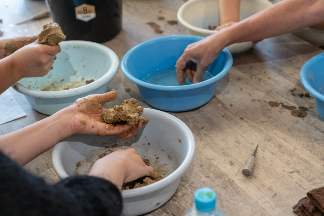 はじめは少しぼろぼろとした状態だった土に、水を少しずつ混ぜながら握っていくと、次第に表面が滑らかになり、もちもちとした質感に変わっていきます。自分の手の中で表情を変えていく様子が目から肌から感じられて、なんだか愛おしい気持ちにもなりました。