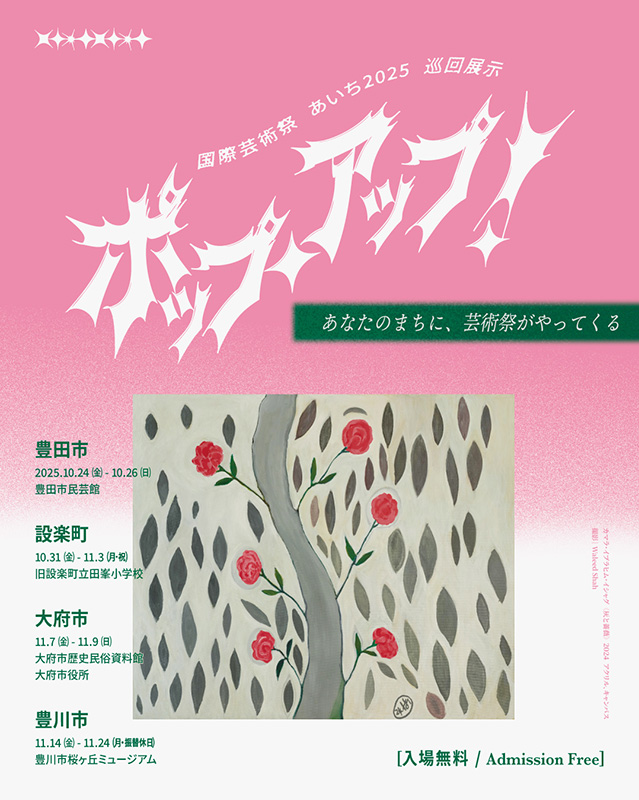 巡回展示「ポップ・アップ!」は、国際芸術祭「あいち2025」に参加する14組のアーティストの作品が県内4つの市町を巡る、移動型の展覧会です。開催市町ごとにバラエティに富んだ空間で、多彩な作品を通じて「あいち2025」のエッセンスをご紹介します。