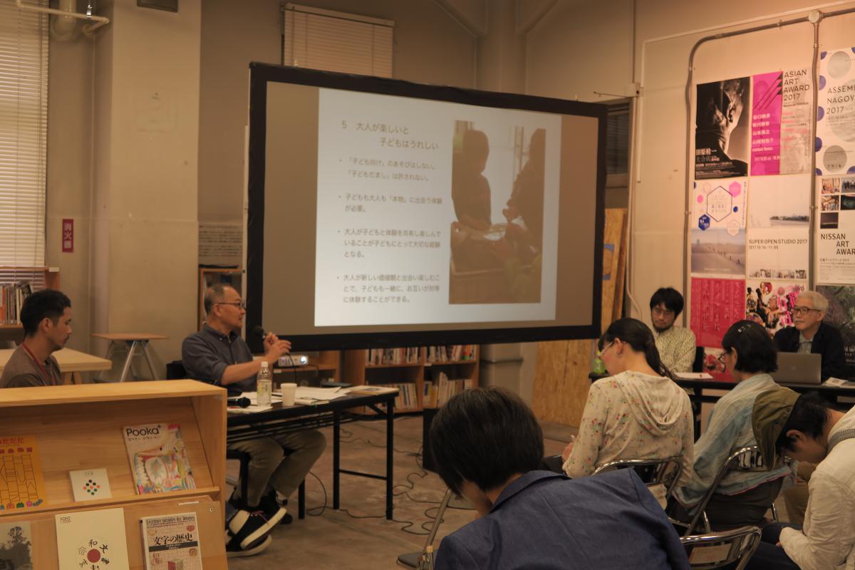センターの紹介から始まり、茂登山先生が関わった、アートとあそびとこどもをつなぐ、という視点での10年間の「汗かくメディア」を振り返り、休憩をはさんで、愛知県美術館学芸員副田さんを交えて、アートのこと、あそびのことについてのディスカッションにうつりました。