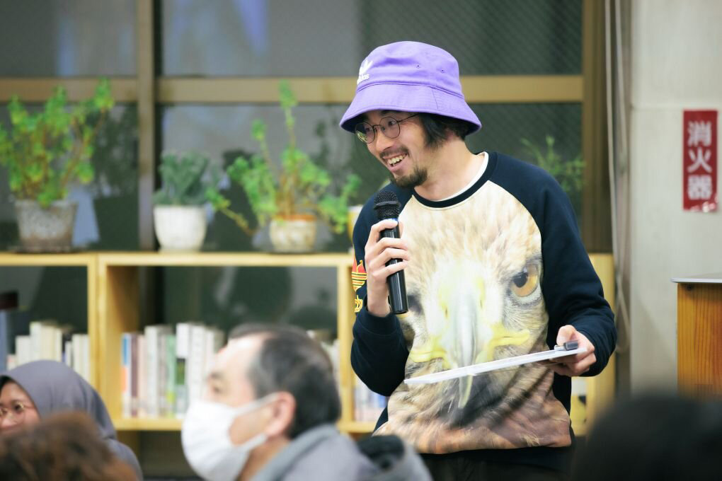 はじめにゲストの活動を紹介するプレゼンテーションからはじまりました。ゲストにお招きしたのは阿部航太さんと児玉美香さんのお二人。デザイナーとして「あいちトリエンナーレ2013」にも関わったことがある阿部さんはデザイン事務所を独立後、フリーランスのデザイナーとして活動しながら、デザイン・文化人類学を指針にアートプロジェクトなどに携わっています。児玉さんは「あいちトリエンナーレ2010」に関わったことをきっかけに、まちと人、アートが関わる活動に興味をもち2014年から2022年まで名古屋市港区のまちづくり協議会で多様な視点をもちながらまちと関わってきました。阿部さんと児玉さんはパートナー同士でもあり、2022年に「地域おこし協力隊」※1として高知県土佐市に移住し、土佐市が掲げていた「国際交流:海外からの技能実習生と地域住民との交流づくり」をミッションに「わくせいプロジェクト」を展開しています。その取り組みはWEBサイト、note、facebook、Instagramなど多様なメディアで発信されています。